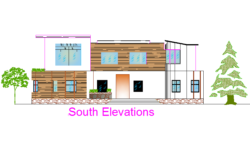 South elevation house detail dwg file, with landscaping detail in both side tree detail, furniture detail door and window detail, stair detail, etc.