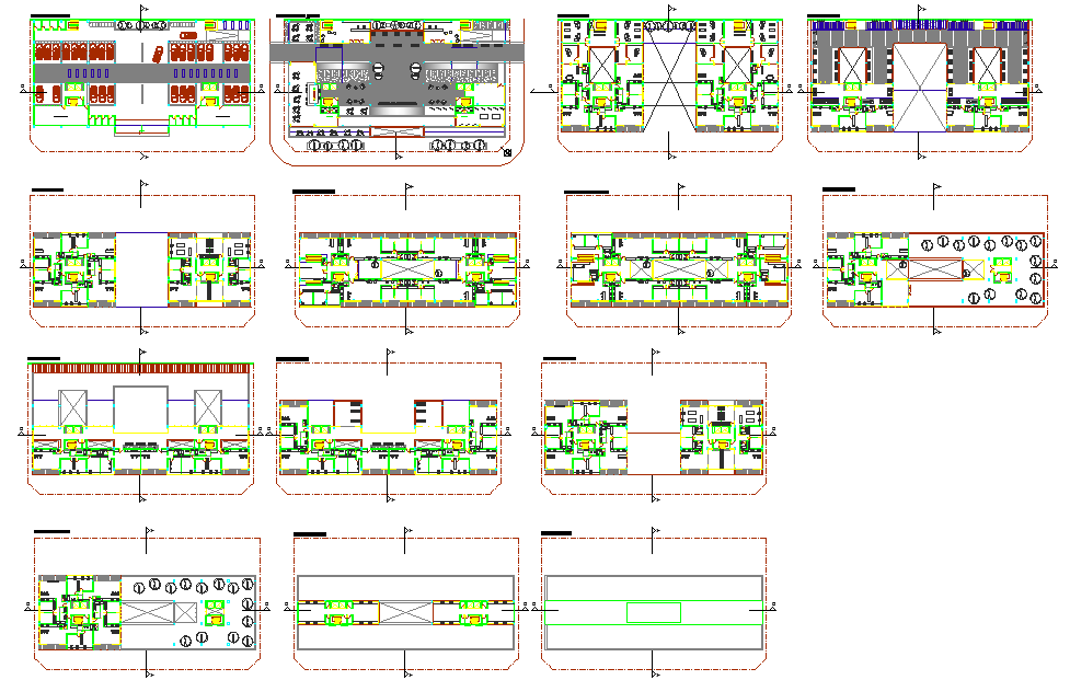 Modern Multi Storey Building DWG File with Floor Layouts and Sections