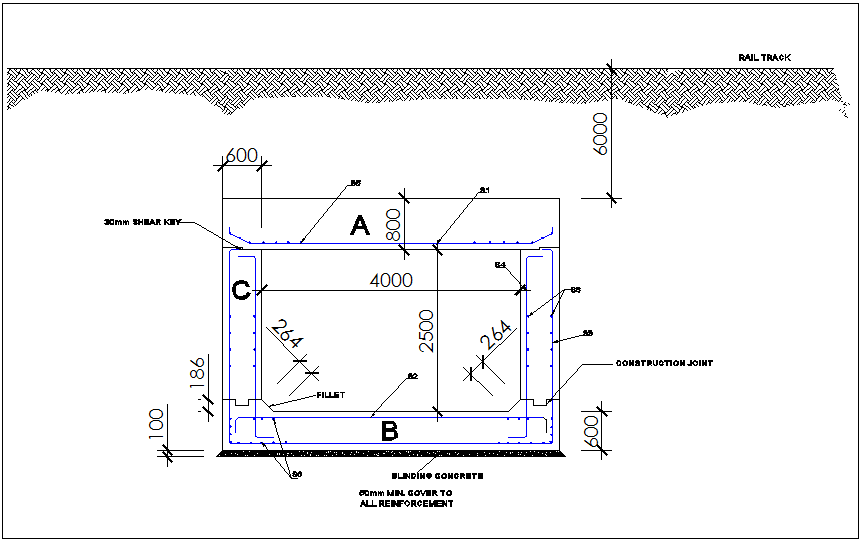 blinding concrete view,wall,wall support with fillet and rail track view with necessary dimension and detail.
