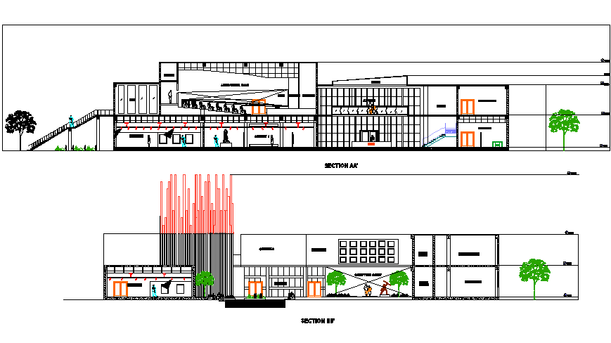 Section peace museum detail dwg file, with section A-A’ detail, section B-B’ detail, landscaping detail with tree and plant detail, dimension detail, naming detail, stair detail, etc.