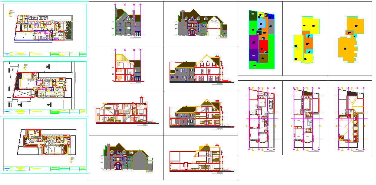 This bungalow project DWG file presents a complete architectural layout for a modern residential complex featuring multiple bungalow units. The drawing includes detailed floor plans, sectional views, and elevation designs that highlight the structure’s design aesthetics and functional organization. Each plan shows carefully arranged living areas, bedrooms, kitchens, and staircases with clear annotations for dimensions and materials. The file also includes structural grids, roof layouts, and zoning maps, giving a comprehensive overview of the project’s site planning.