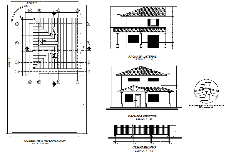 Roof plan, elevation and section house detail dwg file, front elevation detail, back elevation detail, scale detail 1:50 detail, etc.