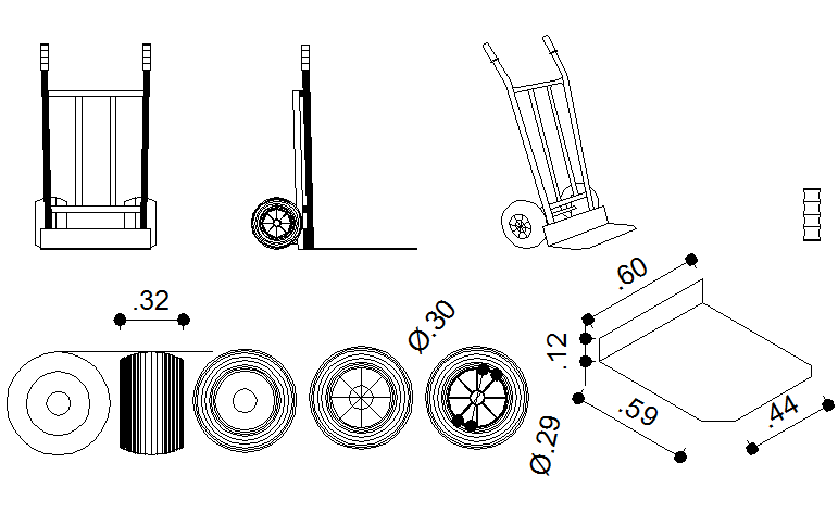 Different shape wheel barrow detail dwg file, with dimension detail, etc.