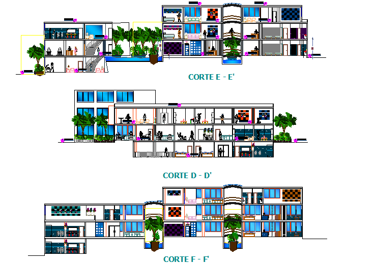 Beauty clinic section detail dwg file, landscaping detail with tree and plant detail, section D-D’ detail, section E-E’ detail, section F-F’ detail, etc.