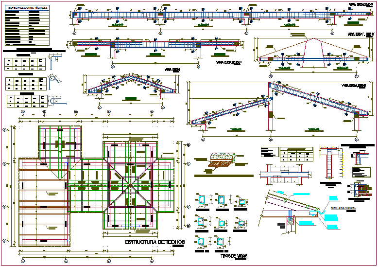 Roof structure with beam and column detail view for initial educative center dwg file