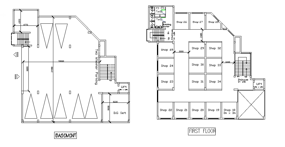 Layout plan of complex with shops, top view of a complex is shown, complete details of shop is given