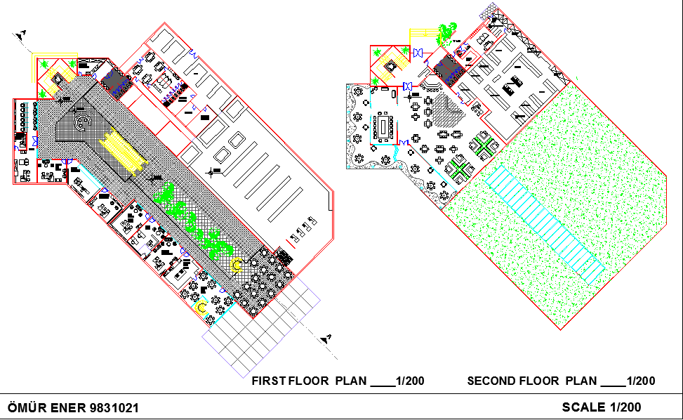 First floor and second floor detail, top view of a complex is shown, restaurant detail is shown , market office