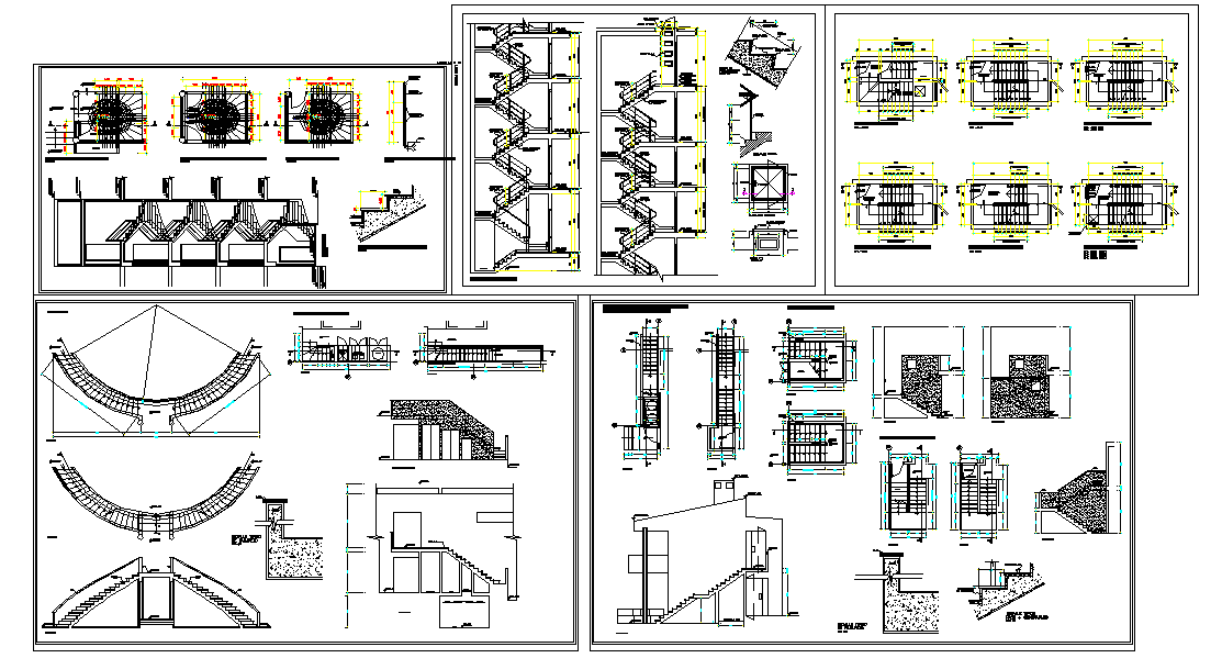 This Stair Detail DWG file provides a complete set of professional drawings covering various staircase designs, including straight, spiral, and curved types. It includes precise reinforcement layouts, tread and riser measurements, and detailed sectional views for accurate construction and execution. The file highlights essential architectural and structural elements such as handrails, landings, supports, and balustrade details.