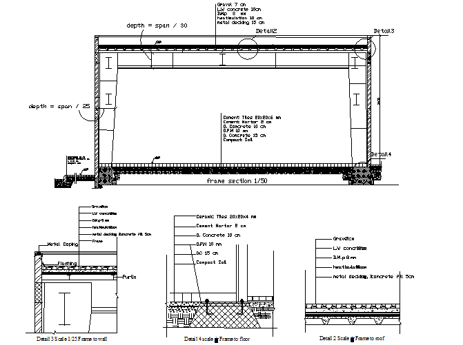 Frame section detail dwg file, with dimension detail, naming detail, section detail, depth and span detail, etc.