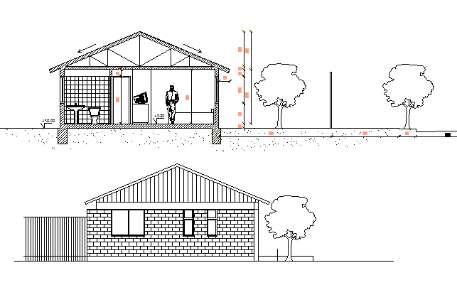 Section house detail dwg file, including toilet section detail, landscaping detail with tree detail, furniture detail with door and window detail, etc.