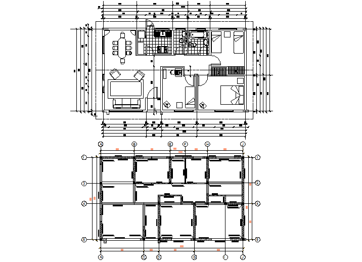 Working house detail dwg file, including center line plan detail, furniture detail in bed, sofa, chair, table, door and window detail, etc.