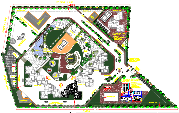 Ground floor plan detail dwg file, including planning architect detail, naming detail, dimension detail, landscaping detail in tree and plant detail, etc.
