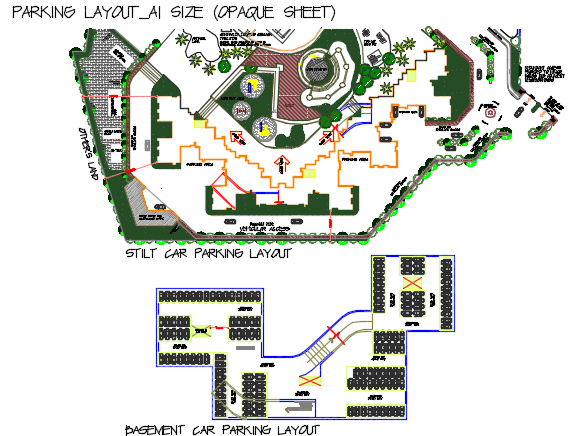 Basement car parking detail dwg file, including landscaping detail in tree and plant detail, etc.