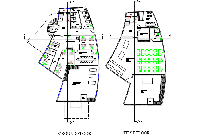 Ground floor to first floor plan detail dwg file, with section line detail, furniture detail with table, chsir, door and window detail, etc.