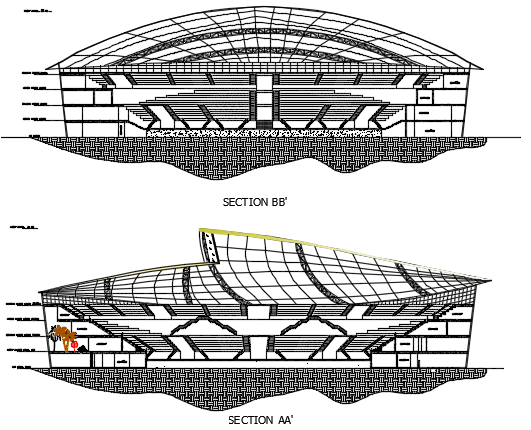 Section indoor stadium detail dwg file, leveling detail, naming detail, section A-A’ detail, section B-B’ detail, etc.