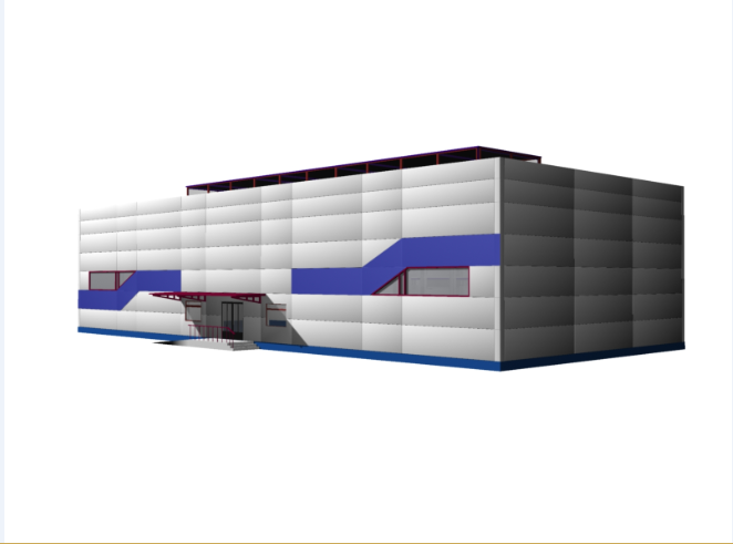 3D view of a corporate building, front complete elevation of a building is shown with material details