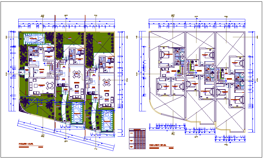 First and second floor plan for multi family building dwg file in first floor plan with view of area view,parking and garden view with entry way,bedroom,kitchen,washing area,