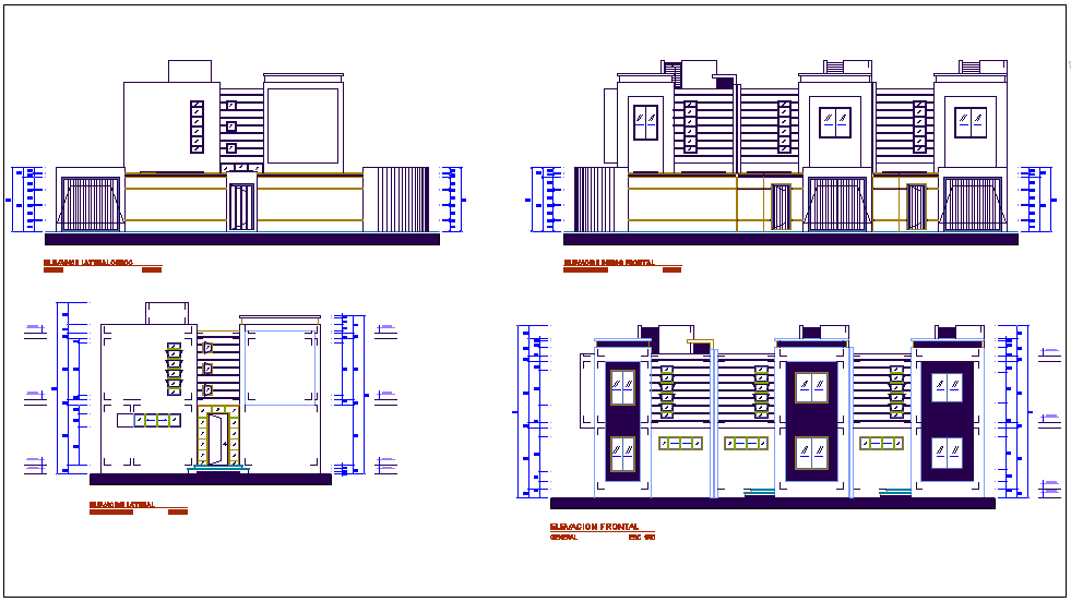 Elevation with different axis section view for multifamily building dwg file in elevation with view of floor,floor level,wall,door and window view and walll support with texture