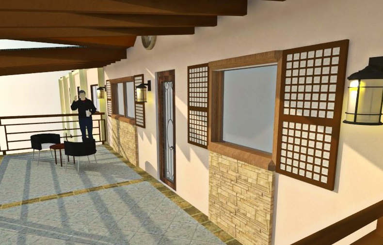 Left side elevation 3 D view detail dwg file, furniture detail in chair, table, door and window detail, etc.