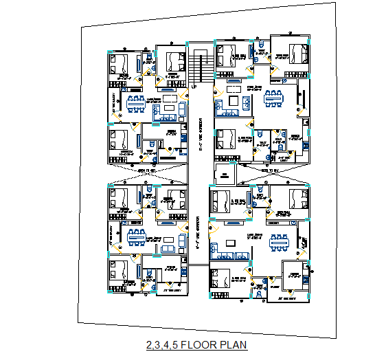 Apartment 2,3,4,5 floor plan detail dwg file, plan design detail, furniture detail with bed, chair, sofa, table, door and window detail, etc.