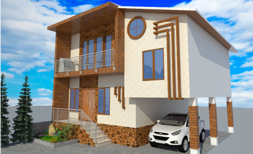 Villa exterior design 3 D detail dwg file, car parking detail, landscaping detail with tree and plant detail, stair detail, etc.