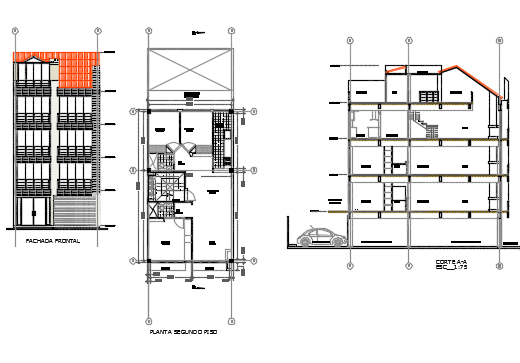 Plan, elevation and section house detail dwg file, including dimension detail, naming detail, front elevation detail, section A-A’m detail, etc.