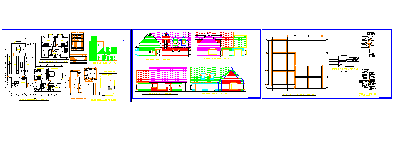 This House Type of Bungalow Project DWG file presents a detailed architectural drawing ideal for residential projects. The plan includes floor layouts, structural details, and elevation views, showcasing a modern bungalow design that balances functionality and visual appeal. The design features spacious living areas, well-planned bedrooms, and open spaces for comfort and ventilation. Roof design, elevation details, and section drawings are precisely illustrated to assist architects and civil engineers in project execution.