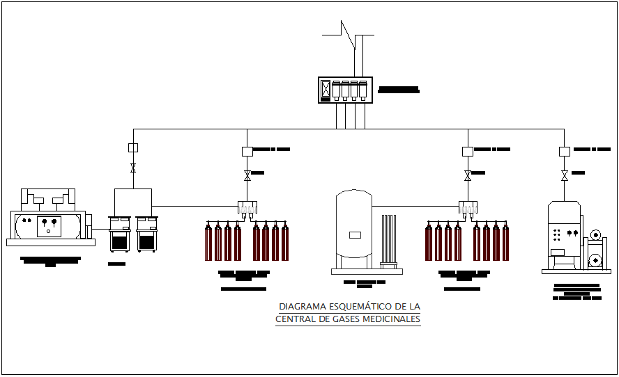 Central medical gases diagram with single line diagram of pipe line for hospital dwg file in view of diagram digital master alarm system view, compressor, oxygen gas cylinder view, with single line diagram of pipe and valve view with its connection.