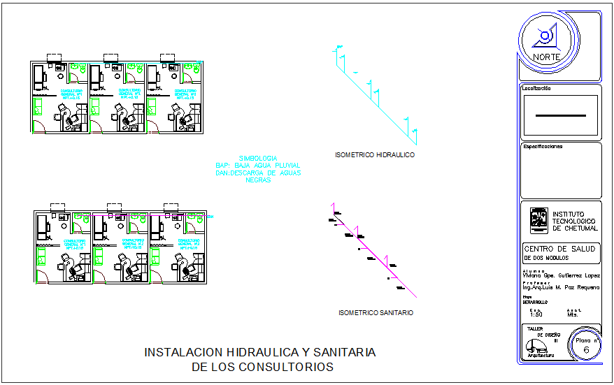 Hydraulic and sanitary installation view with single line pipe diagram view for clinic dwg file in hydraulic plan with clinic area and washing area view with water tub and water single line view and sanitary view with washing area and single water line view and isometric view of both water line view with necessary dimensional detail.