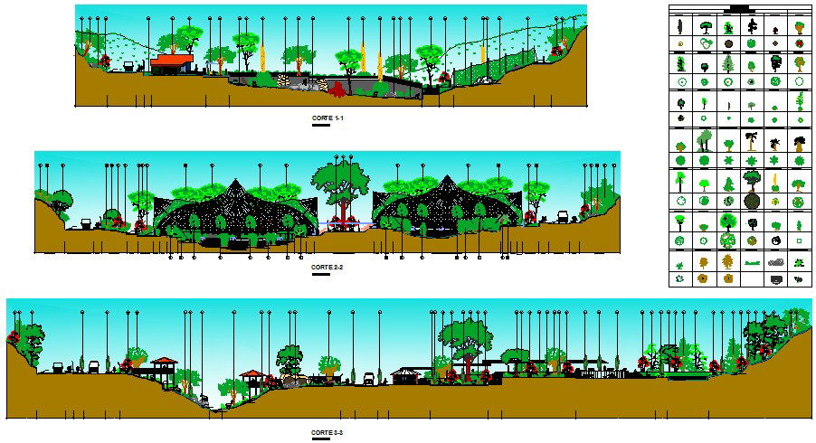 General section of zoo detail dwg file, including landscaping detail with tree and plant detail, centre line plan detail, different type of tree detail, dimension detail, naming detail, etc.