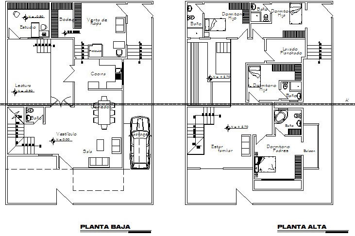 Single family house plan detail dwg file, including naming detail, leveling detail, section line detail, car parking detail, etc.