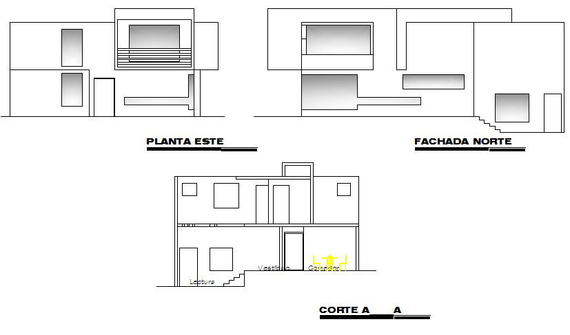 Elevation and section house detail dwg file, with front elevation detail, side elevation detail, section A-A’ detail, etc.