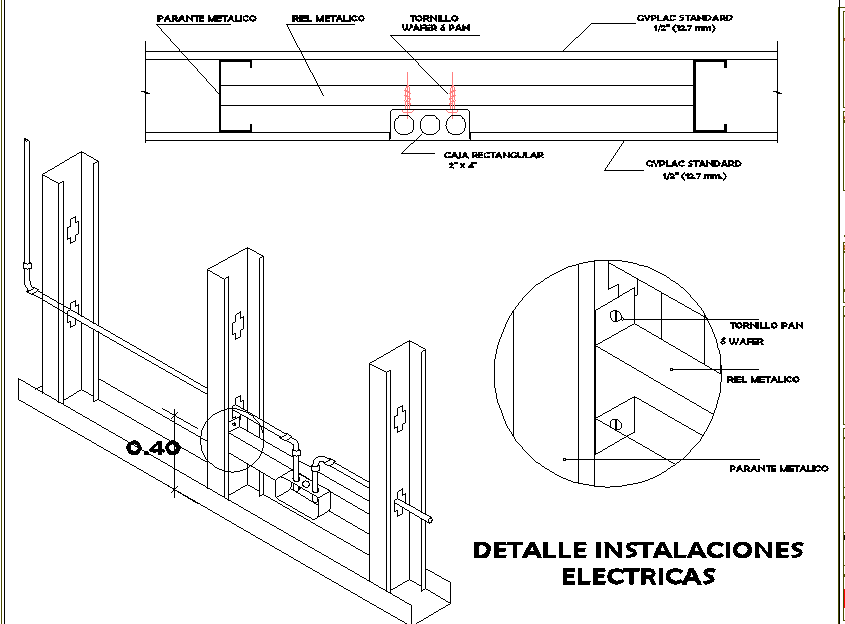 Electric installation detail drawing.detail plan, isometric view, installation blow up detail, metal panel, installation detail, metal rail and joinery detail with description detail.