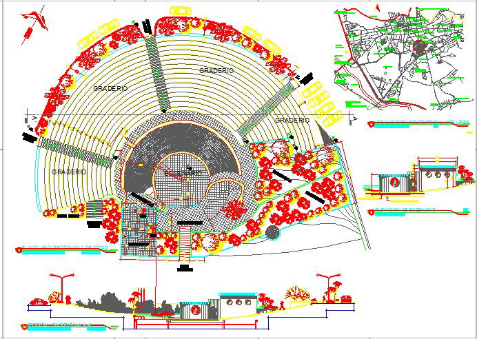 Theater project detail dwg file, with section line detail, landscaping detail with plant and tree detail, car parking detail, etc.