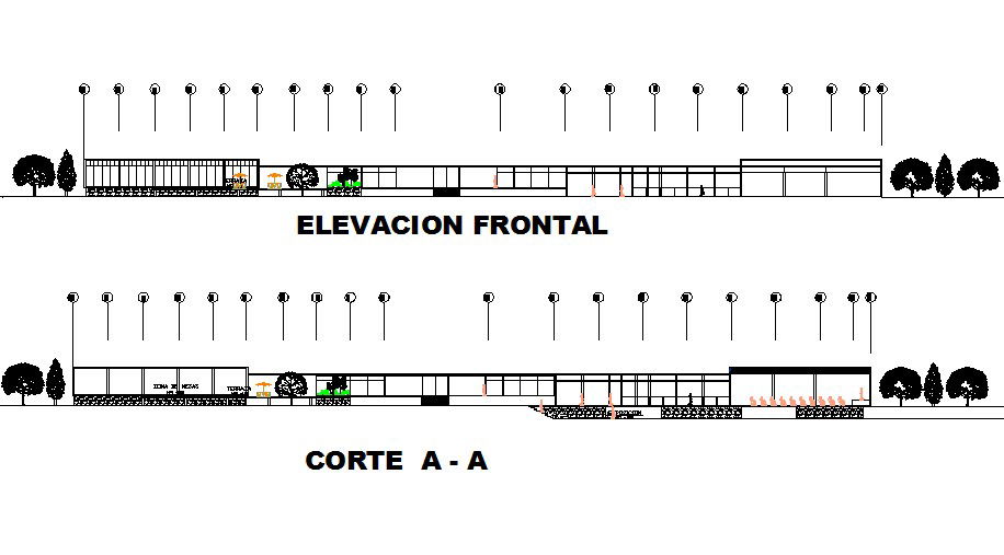 Elevation and section restaurant detail dwg file, with centre line plan detail, landscaping detail with tree and plant detail, etc.