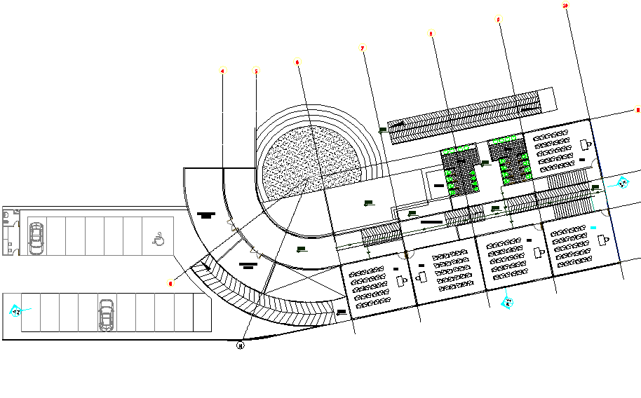 Working drawing of school with detail. Detail plan, section, front and side elevation, with the detail of section line,entrance, classroom, parking, ramp, lab, lobby, admin area, teacher’s room information center, amphitheater, etc detail.