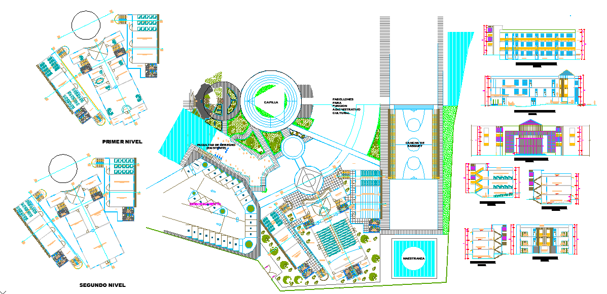 This Club House Design DWG file presents a complete architectural layout that reflects modern recreational and community design principles. The plan includes detailed floor layouts, sectional drawings, and elevation views that capture the structure’s functional and aesthetic elements. Each area—lounge, cafeteria, gym, sports court, and landscaped spaces—is carefully designed to promote social engagement and leisure. The spatial arrangement ensures smooth circulation and accessibility while maintaining visual appeal through contemporary architectural styles.