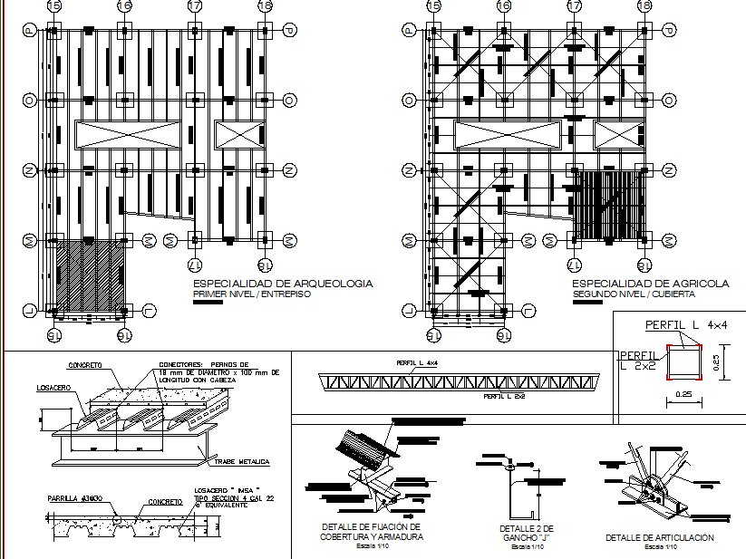 Structure drawing of roof. Roof detail with plan,roof plan, isometric view of detail,column detail, joinery detail, articulation detail, truss detail, with section line,dimensions and other detail.