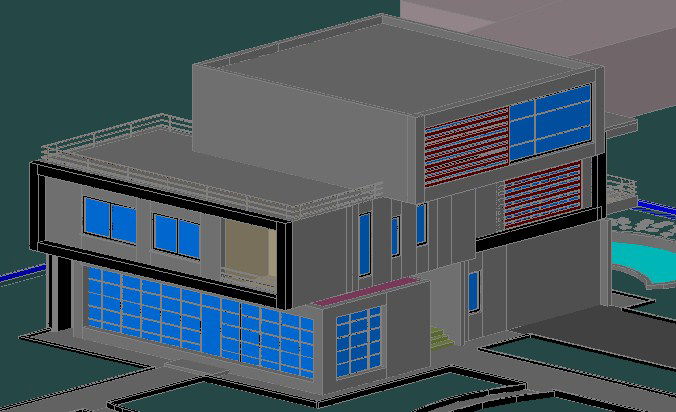 3 D house detail dwg file, including front elevation detail, balcony reeling detail, furniture detail with door and window detail, etc.