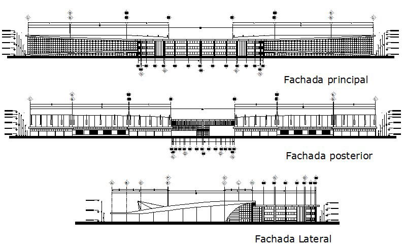 Elevation convention center detail dwg file, with front elevation detail, back elevation detail, side elevation detail, etc.