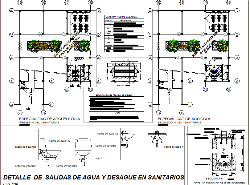 Detail drawing of water outputs and drainage in sanitary. Plan,section,elevation of water outputs and drainage in sanitaries with blowup detail,legend, description,notes and dimension etc.