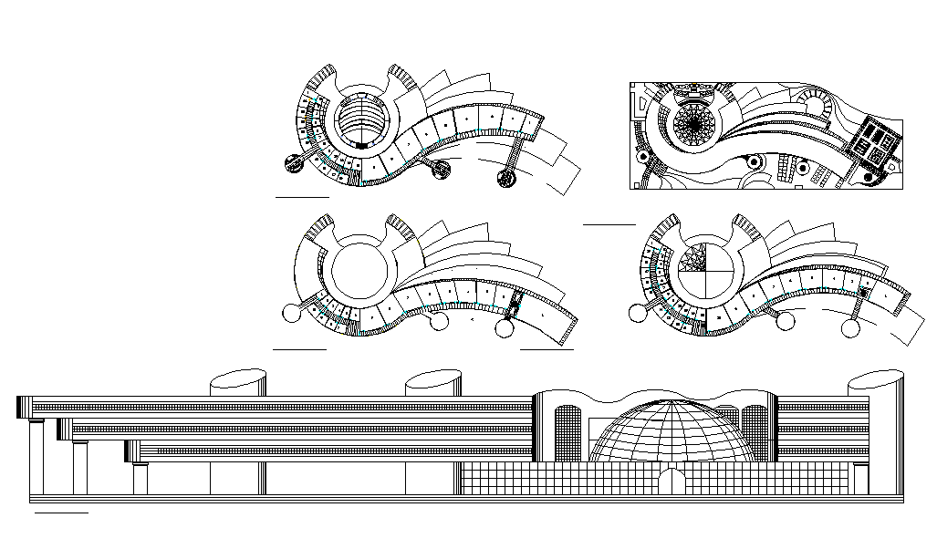 art faculty campus building detail drawings. Detail all floor plan and elevation of art faculty campus with glass window facade detail, geodesic dome,main entrance,3 circular toilet block, 1st,2nd,and 3rd floor rest on 3 different column support.