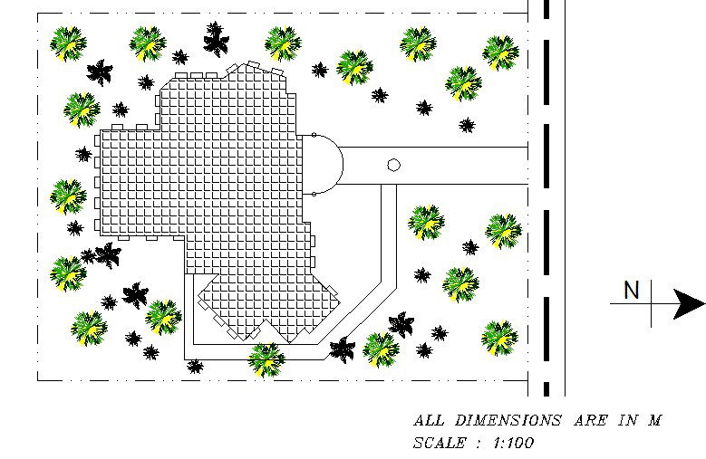 Library roof plan detail dwg file, including north direction detail, landscaping detail with plant and tree detail, etc.