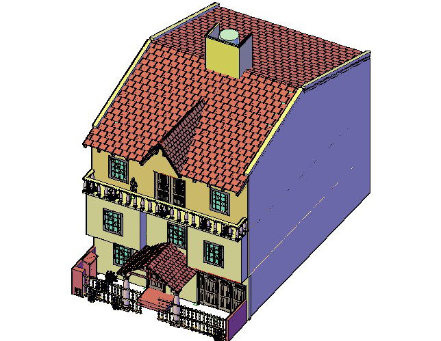 House 3 D detail dwg file, including chimney detail, front view detail, main gate detail, balcony detail, etc.