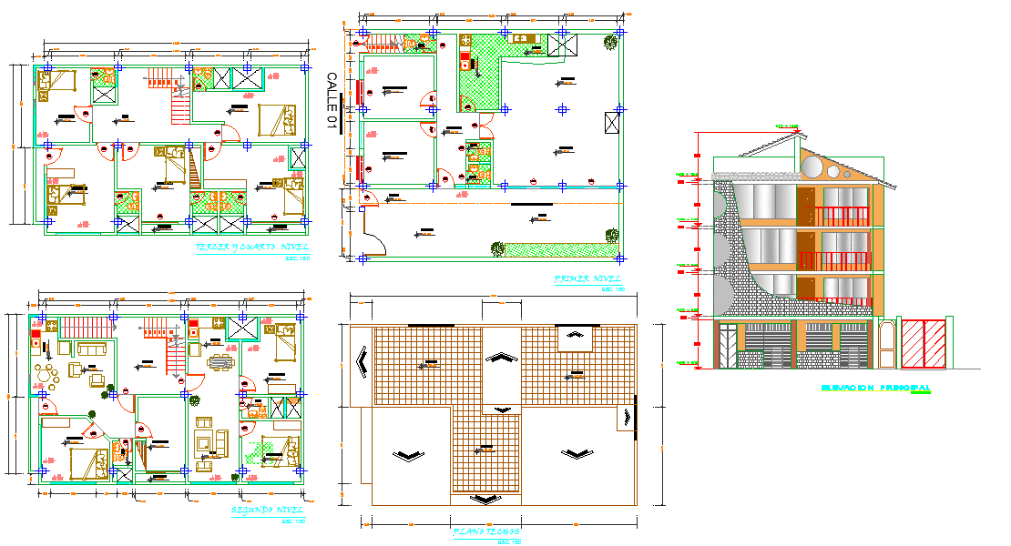 This AutoCAD DWG file showcases a comprehensive apartment drawing plan that includes detailed floor layouts and an elevation view of a multi-storey residential building. The plan features multiple levels — ground, second, third, and terrace floors — with well-arranged spaces for living areas, bedrooms, kitchens, dining rooms, and balconies. The layout provides a modern and efficient design concept ideal for multi-family housing developments.