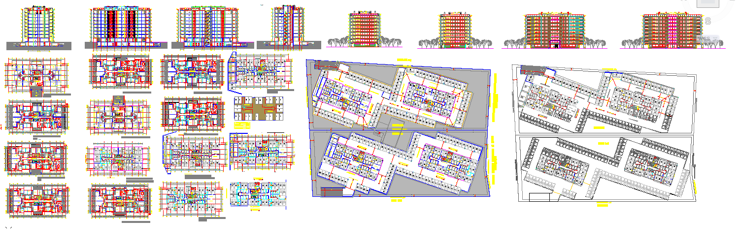 The elevation views reveal a modern building façade with structured symmetry and vertical rhythm, ideal for large-scale residential developments. The sectional drawings further detail the internal connections between floors, circulation cores, and common spaces. This DWG file is ideal for architects, civil engineers, and builders working on vertical housing or urban infrastructure projects. It serves as a professional reference for designing efficient, sustainable, and aesthetically appealing multi-family housing solutions that meet urban living standards.