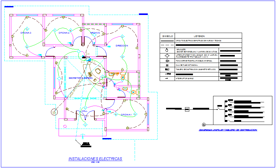 Electrical installation plan of office dwg file in plan with view of area view of office with wall view and electrical line view with its connection and joint with its legend view and view of distribution board of electrical system with necessary detail.
