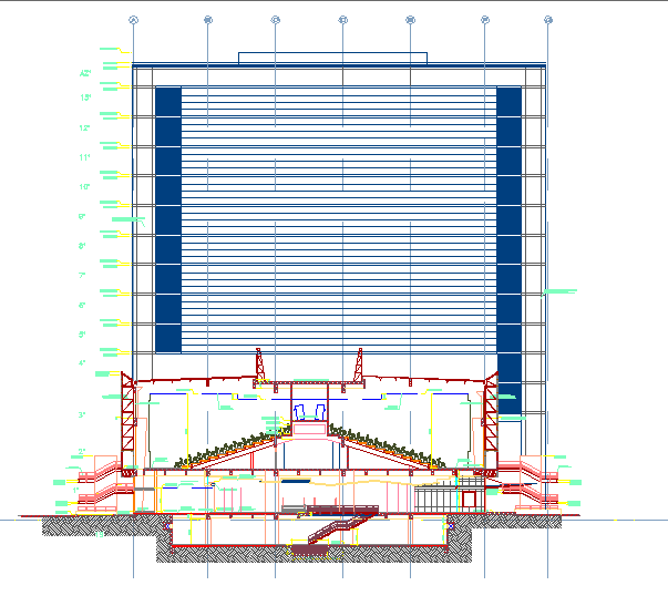 cinema room section dwg file with ceiling detail,projector room,sitting detail,stairs detail,beam detail,level detail measurenment detail etc.