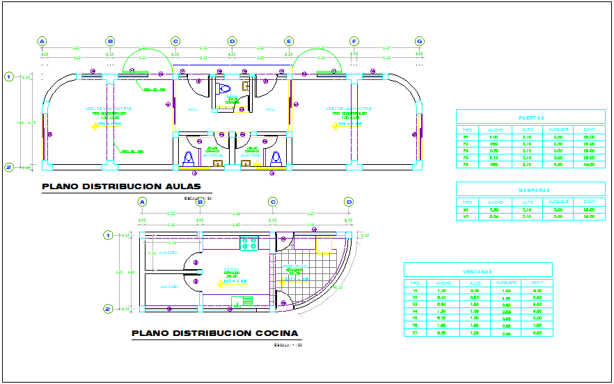 Classroom and kitchen distribution plan with view of door and window detail dwg file