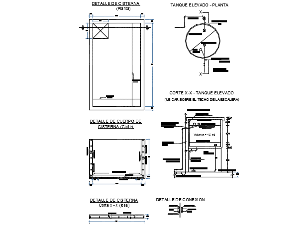Detail of cistern dwg file, including plan, elevation and section detail, dimension detail, naming detail, etc.